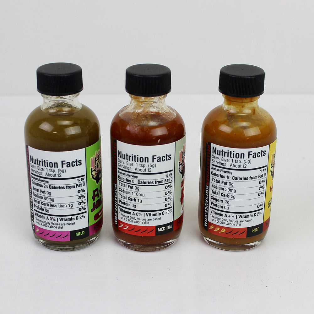 This sampler comes from a hot sauce born in Manhattan's Hell's Kitchen neighborhood. They create a great line of hot sauces that have a nice balance between flavor and heat. This set contains 3 sauces that show the range of their sauces.